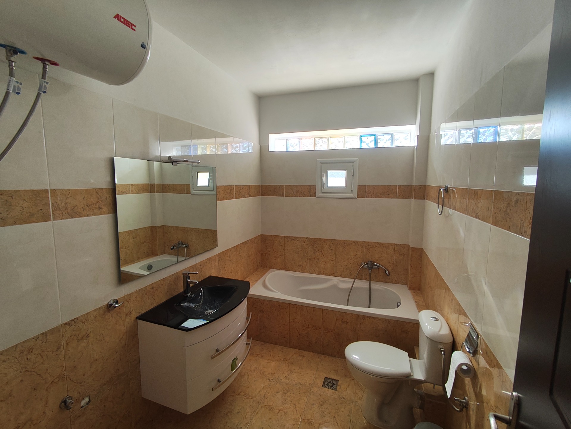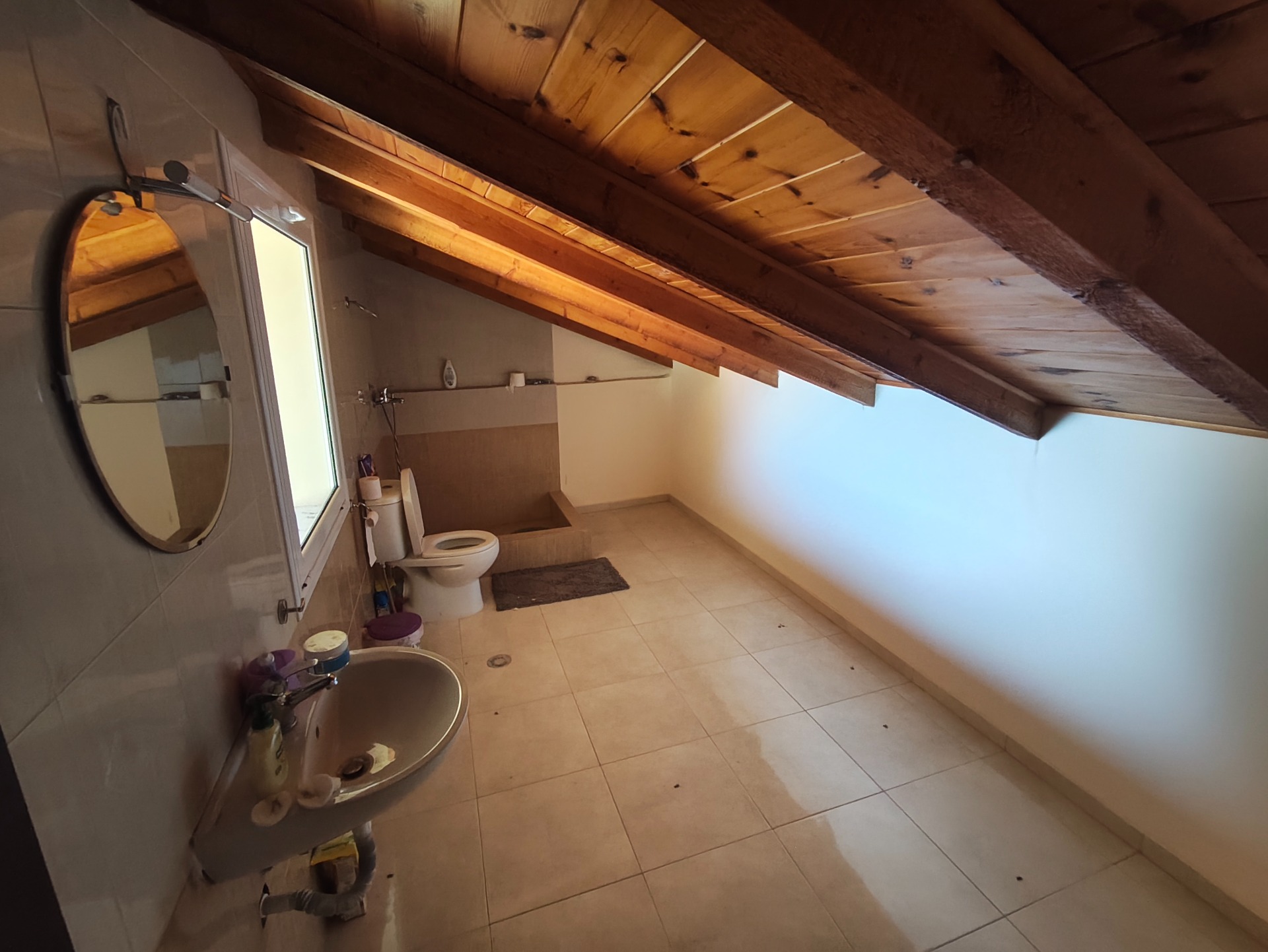 This is an apartment in a small residential complex with direct access to the beach. It consists of 2 levels. On the first of 90m2 there is a spacious living room with a terrace overlooking the sea, a kitchen, a bathroom and 2 bedrooms. An internal staircase leads to the 70sqm attic where there is an additional bathroom and an open space that could be used as a bedroom, guest room, office, play room, etc. It is bright, airy, with mountain and sea views and within walking distance there are shops, restaurants, etc.